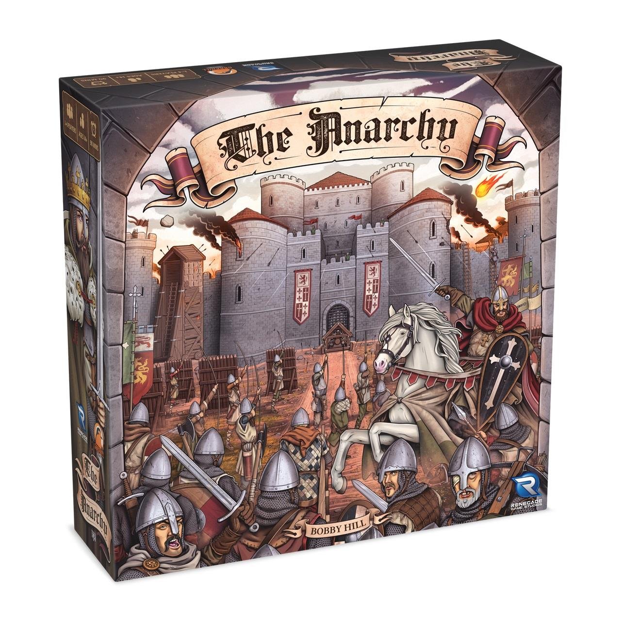 In The Anarchy, players take on the role of English nobles loyal to King Stephen. Over five rounds, players must build their domain, defend their castle from attacks by the approaching Anjevin armies, and storm strongholds loyal to Matilda with their own crafted siege weapons. The player who can accumulate the most Bravery, Loyalty, Influence and Might, whilst avoiding Discontent, will prove to King Stephen they are his most loyal ally, granting them his largest earldom.