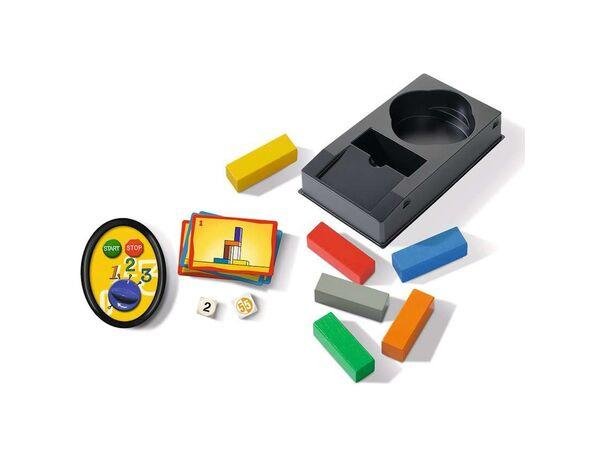 Building blocks for adults? In this fast-paced game, players must uncover and copy building plans of various difficulty, each showing 10 colored blocks in a particular arrangement, before the timer runs out. An advanced variant allows player to pass undesirable plans to their neighbor and take the one they would have drawn.