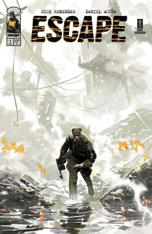 SERIES PREMIERE SHOT DOWN. HUNTED. OUT OF TIME. THE NEW ONGOING TWO-FISTED WAR EPIC FROM REMENDER & ACU A STARTS HERE. From the creative team of**_ New York Times_** bestselling author RICK REMENDER (DEADLY CLASS, Uncanny X-Force) and powerhouse DANIEL ACU A (Captain America, Black Panther)-the duo behind Marvel's **Uncanny Avengers**-comes a savage, full-throttle wartime thriller where survival isn't given...it's taken. Milton Shaw is a battle-hardened bomber pilot, flying missions over a war-torn world ruled by a ruthless empire. But when his plane is shot out of the sky, Milton wakes up behind enemy lines-in the smoldering ruins of a city he helped burn. And in less than 24 hours, his own side is dropping the big one to finish the job. Now, injured, unarmed, and being hunted through enemy streets, Milton's only shot at escape comes from the unlikeliest place: a grieving father and his son-civilians shattered by the same fascist regime that rules this land with an iron claw. Enemies by blood. Allies by circumstance. Together, they'll have to fight their way out before the bomb drops and erases everything...and everyone. Set in a brutal, fully painted world of anthropomorphic animals-think Inglourious Basterds meets Blacksad-ESCAPE is a gritty, bullet-riddled journey through war's scorched aftermath. It's about the violence we inflict, the souls we try to save, and the courage it takes to crawl out of fire.