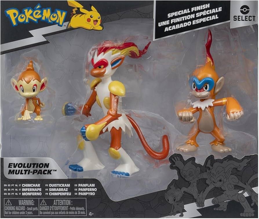 Complete your collection with the 4.5-inch Infernape Battle Feature Figure, equipped with a jumping attack for exciting gym battles. Display all three figures together to reveal a special finish that is exclusive to Pokemon Select Evolution Packs.