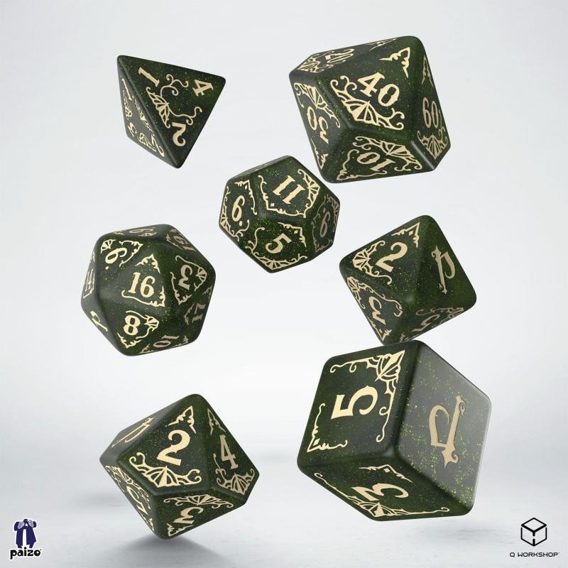 The Pathfinder Dice Set: Arcadia is an officially licensed 7-piece polyhedral dice set, meticulously crafted by Q WORKSHOP in collaboration with Paizo Inc., designed to enhance your Pathfinder role-playing experience.