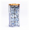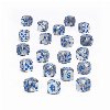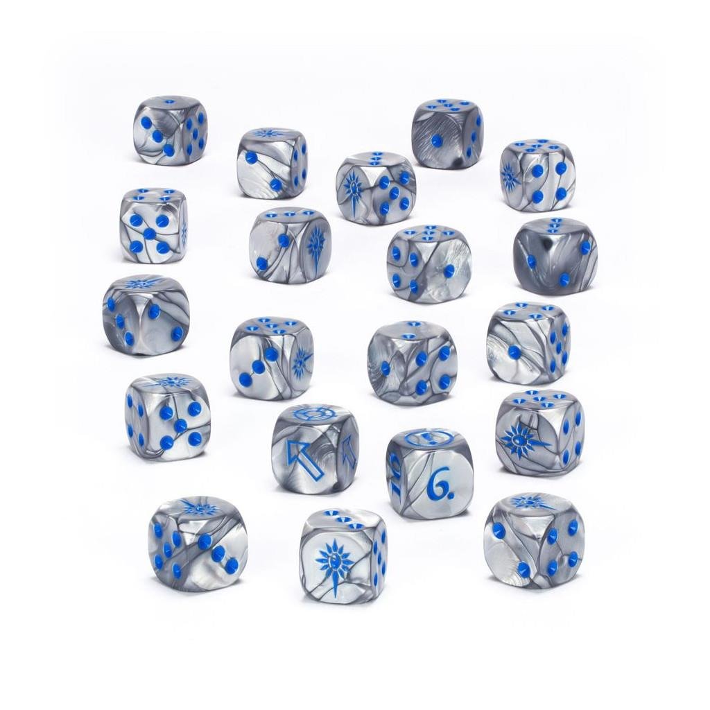 This is a set of 20 round-cornered six-sided dice for use in games of Warhammer: The Old World, themed around the High Elf Realms. They are cast in a pearlescent silver swirl acrylic plastic with metallic blue ink pips and designs, and measure 16mm along each edge. On the standard D6s, the 1-5 facings are traditionally pipped, and each '6' face is decorated with the icon of the High Elf Realms.