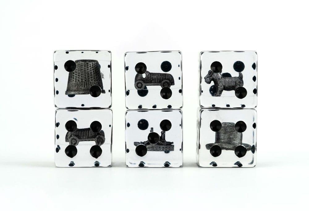 The Official Monopoly inclusion dice set features oversized d6's infused with the Monopoly game pieces. At 22mm, these oversized dice are a unique addition to any collection!