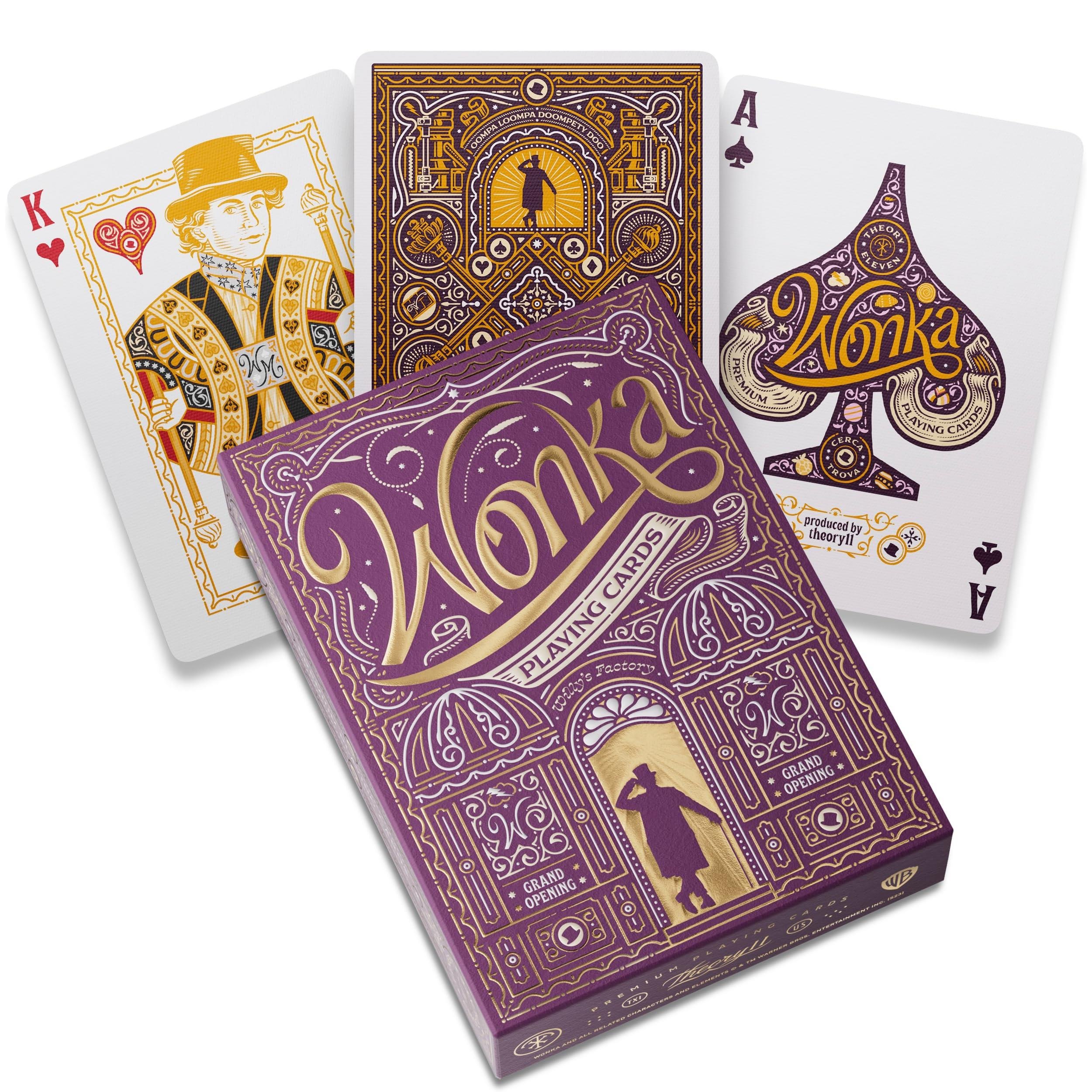 The "Theory11 - Wonka Playing Cards" is a premium collectible deck inspired by the whimsical world of Willy Wonka. Designed by Theory11, renowned for their high-quality playing cards, this deck brings the enchanting universe of Willy Wonka to life with intricate designs and luxurious finishes.