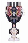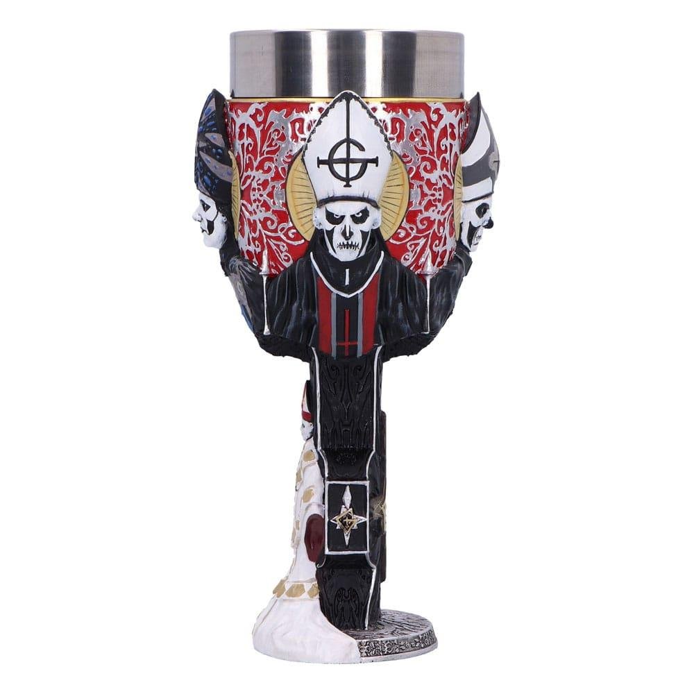 Raise a toast to the macabre with the officially licensed Ghost Papa Evolution Goblet, a stunning tribute to the iconic Swedish rock band, Ghost. This intricately designed goblet captures the evolution of the enigmatic Papa Emeritus character in a breathtaking wraparound design, sure to captivate fans and collectors alike. The detailed artistry also extends to the stem, where a striking cross and the Papa figure add a layer of mystery and power. With its removable stainless steel insert, this goblet offers both practicality and an air of dark sophistication.