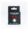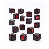 This is a set of 16 six-sided dice with squared edges for use in games of Warhammer 40,000, themed around the Black Templars. They are cast in pearlised black and grey swirl acrylic plastic with red ink markings, and measure 16mm along each edge. The 1-5 facings are traditionally pipped and each ‘6’ face is decorated with the faithful icon of the Black Templars.
