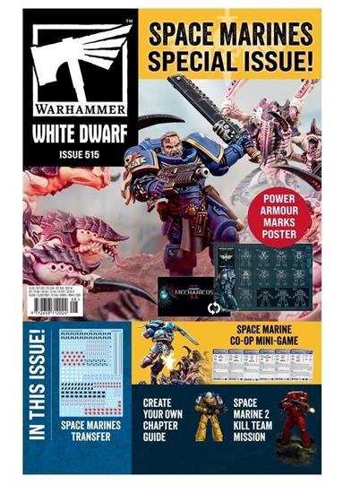 Each copy of White Dwarf 515 also comes with a cardboard insert containing a double-sided card featuring the scenarios of the month for Warhammer 40,000 and Warhammer Age of Sigmar, a Space Marines Transfer Sheet containing 442x transfers, an A2 poster featuring Space Marine Armour Marks on one side and Warhammer 40,000: Mechanicus II on the other, and 8x double-sided cards for the Space Marine Operations mini-game.