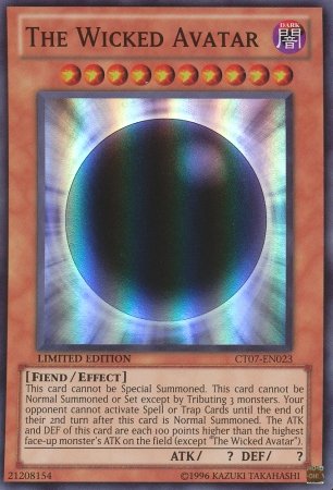 Monster Type: Fiend Attribute: Dark Set: 2010 Collectors Tin Level: 10 Card Number: CT07-EN023 Rarity: Super Rare Card Text: This card cannot be Special Summoned. This card cannot be Normal Summoned or Set except by Tributing 3 monsters. Your opponent cannot activate Spell or Trap Cards until the end of their 2nd turn after this card is Normal Summoned. The ATK and DEF of this card are each 100 points higher than the highest ATK on the field (except "The Wicked Avatar"). ATK/DEF: ?/? Card Type: Effect Monster