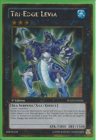 Set: Premium Gold ATK/DEF: 1800/1500 Card Number: PGLD-EN026 Monster Type: Sea Serpent/Xyz/Effect Rarity: Gold Secret Rare Attribute: Water Card Text: 3 Level 3 monsters Banish any monster destroyed by battle with this card. Once per turn, during either player's turn: You can detach 1 Xyz Material from this card, then target 1 face-up monster on the field; this turn, that monster loses 800 ATK, also its effects are negated. Level: 3 Card Type: Xyz Monster Name: Tri-Edge Levia Edition: 1st