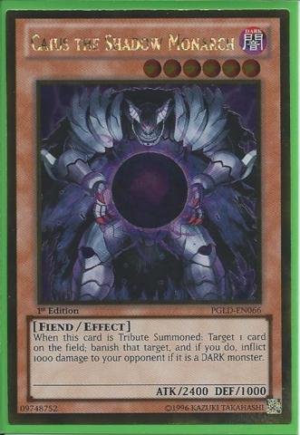 Set: Premium Gold ATK/DEF: 2400/1000 Card Number: PGLD-EN066 Monster Type: Fiend/Effect Rarity: Gold Rare Attribute: Dark Card Text: When this card is Tribute Summoned: Target 1 card on the field; banish that target, and if you do, inflict 1000 damage to your opponent if it was a DARK monster. Level: 6 Card Type: Effect Monster Name: Caius the Shadow Monarch Edition: 1st