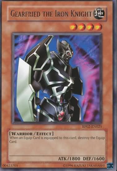Level: 4 Card Number: RP02-EN025 Rarity: Rare Card Text: When an Equip Card is equipped to this card, destroy the Equip Card. ATK/DEF: 1800/1600 Card Type: Effect Monster Monster Type: Warrior Attribute: EARTH Set: Retro Pack 2 Name: Gearfried the Iron Knight