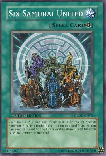 Card Text: Each time a 'Six Samurai' monster(s) is Normal or Special Summoned, place 1 Bushido Counter on this card (max. 2). You can send this card to the Graveyard to draw 1 card for each Bushido Counter on this card. ATK/DEF: Card Type: Continuous Spell Monster Type: Attribute: Spell Set: Gold Series 2 Level: Card Number: GLD2-EN042 Rarity: Common Edition: Limited