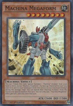 Set: The New Challengers ATK/DEF: 2600/1500 Card Number: NECH-EN036 Monster Type: Machine Rarity: Super Rare Attribute: Earth Card Text: You can Tribute this card; Special Summon 1 "Machina" monster from your hand or Deck, except "Machina Megaform". If a "Machina Fortress" you control is sent to the Graveyard, while this card is in your Graveyard (except during the Damage Step): You can banish 1 "Machina Fortress" from your Graveyard; Special Summon this card. You can only use 1 "Machina Megaform" effect per turn, and only once that turn. Level: 8 Card Type: Effect Monster Name: Machina Megaform