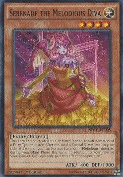 Set: The New Challengers ATK/DEF: 400/1900 Card Number: NECH-EN005 Monster Type: Fairy Rarity: Common Attribute: Light Card Text: This card can be treated as 2 Tributes for the Tribute Summon of a Fairy-Type monster. During the turn this card was Special Summoned, you can Normal Summon 1 "Melodious" monster in addition to your Normal Summon/Set. (You can only gain this effect once per turn.) Level: 4 Card Type: Effect Monster Name: Serena the Melodious Diva