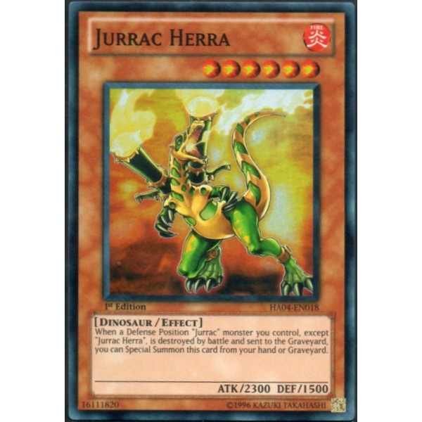 Card Type: Effect Monster Monster Type: Dinosaur Attribute: Fire Set: Hidden Arsenal 4: Trishulas Triumph Level: 6 Card Number: HA04-EN018 Rarity: Super Rare Card Text: When a Defense Position "Jurrac" monster you control, except "Jurrac Herra", is dest