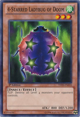 Set: Starter Deck: Yugi Reloaded ATK/DEF: 800/1200 Card Number: YSYR-EN010 Monster Type:Insect Rarity: Common Attribute: Wind Card Text: FLIP: Destroy all Level 4 monsters your opponent controls. Level: 3 Card Type: Effect Monster Name: 4-Starred Ladybu