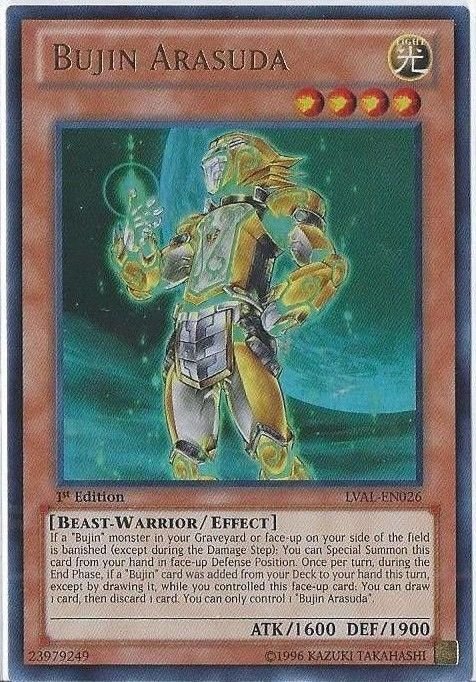 Set: Legacy of the Valiant ATK/DEF: 1600/1900 Card Number: LVAL-EN026 Monster Type: Beast-Warrior Rarity: Attribute: Light Card Text: If a "Bujin" monster you control or in your Graveyard is banished: You can Special Summon this card from your hand in face-up Defense Position. During the End Phase, if you added a "Bujin" monster from your Deck to your hand this turn, except by drawing, while this card was face-up: You can draw 1 card, then discard 1 card. You can only control 1 "Bujin Arasuda". Level: 4 Card Type: Effect Monster Name: Bujin Arasuda Edition: 1st