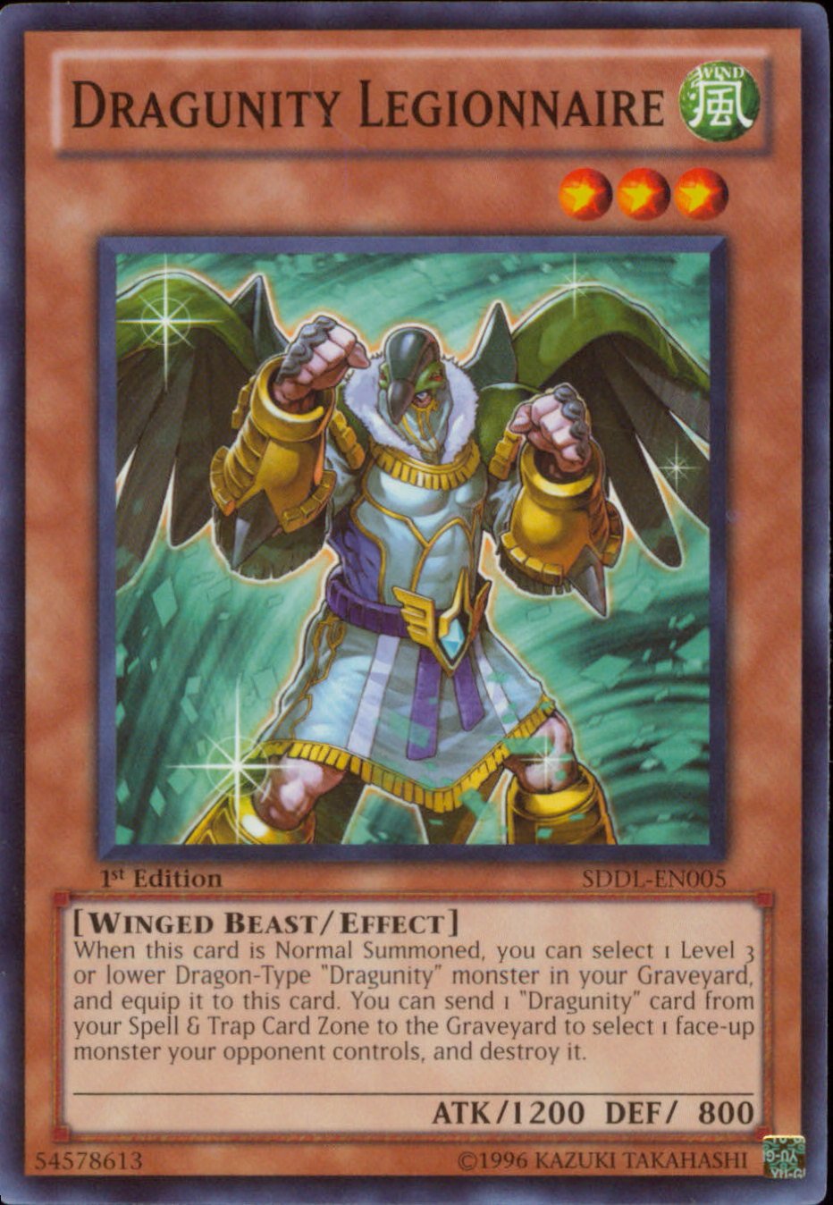 Card Text: When this card is Normal Summoned, you can select 1 Level 3 or lower "Dragunity" Dragon-Type monster in your Graveyard, and equip it to this card as an Equip Card. You can send 1 "Dragunity" card from your Spell & Trap Card Zone to the Graveyard to select 1 face-up monster your opponent controls, and destroy it. ATK/DEF: 1200/800 Card Type: Effect Monster Monster Type: Winged Beast Attribute: Wind