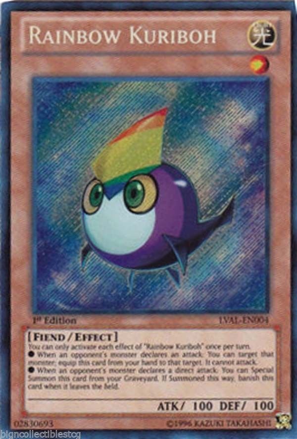 Set: Legacy of the Valiant ATK/DEF: 100/100 Card Number: LVAL-EN004 Monster Type: FiendRarity: Attribute: Light Card Text: You can only use each effect of "Rainbow Kuriboh" once per turn. When an opponent's monster declares an attack: You can target the attacking monster; equip this card from your hand to the attacking monster. It cannot attack. When an opponent's monster declares a direct attack: You can Special Summon this card from your Graveyard. If you do, banish it when it leaves the field. Level: 1 Card Type: Effect Monster Name: Rainbow Kuriboh Edition: 1st